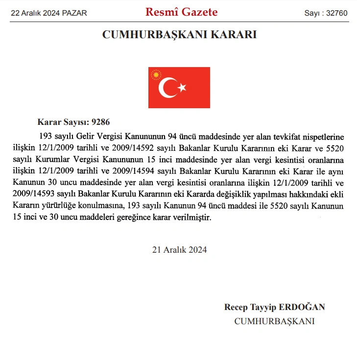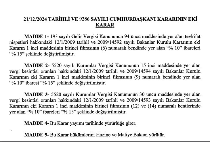 Cumhurbaşkanı Recep Tayyip Erdoğan'ın imzası ile yayımlanan karara göre asgari kurumlar vergisi oranı yüzde 10'dan yüzde 15'e yükseltildi.