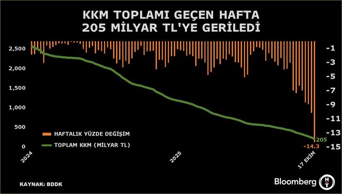 Bankacılık Düzenleme ve Denetleme Kurumu’na göre, Kur Korumalı Türk Lirası Mevduat ve Katılma Hesapları (KKM) 17 Ekim haftasında 34 milyar 232 milyon TL azalarak, 205 milyar 311 milyon TL’ye geriledi.