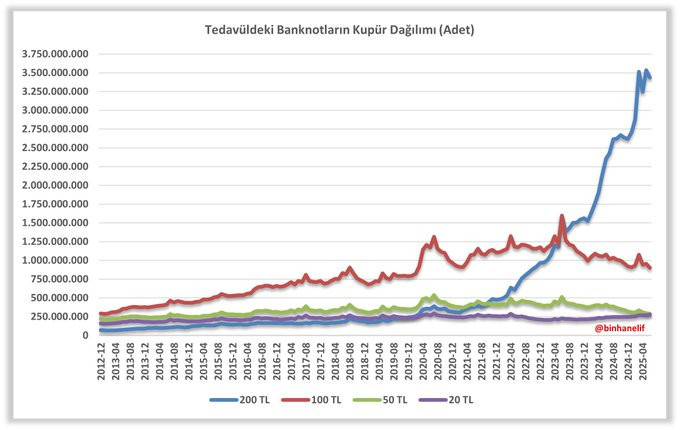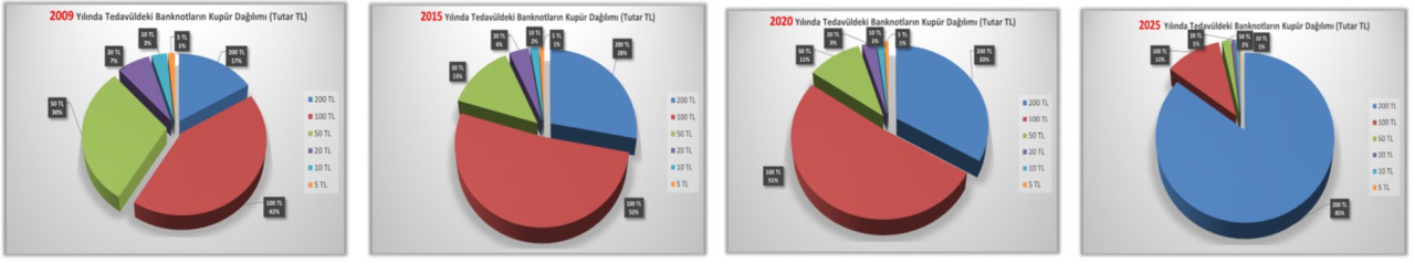 Toplam dolaşımdaki paranın 2009’da sadece yüzde 15,8’i 200 TL'lik banknottu. Yaklaşık on yıl sonra dolaşımdaki payı yüzde 30’u aştı. Ancak ne olduysa son üç-dört yılda oldu (yukarıda nedenlerini anlattım). Özellikle 2020 sonrasında dramatik bir artış ortaya çıktı. Bu da enflasyonun etkisini yansıtan güçlü bir işaret.