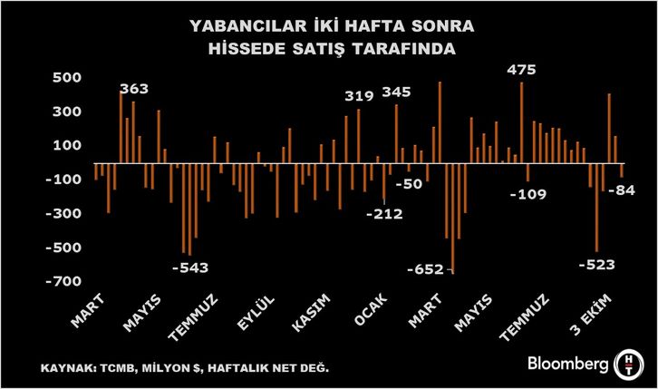 Yurt dışı yerleşikler 3 Ekim haftastınsa iki haftanın ardından 84 milyon dolarlık hisse sattı. Yabancının tahli satışı da 234 milyon dolar olarak gerçekleşti.