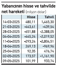 Merkez Bankası haftalık menkul kıymet verilerini açıkladı. Buna göre yurt dışında yerleşik kişiler, 9 Mayıs haftasında net 102 milyon dolarlık hisse senedi ve 933.7 milyon dolarlık Devlet İç Borçlanma Senedi (DİBS) alırken, 7.3 milyon dolarlık Genel Yönetim Dışındaki Sektör (ÖST) varlığı sattı. Yabancının 19 Mart'tan bu yana tahvilde net satışı ise 8 milyar 373 milyon dolar, hissede ise 1 milyar 197 milyon dolara ulaştı. Mayısın ilk iki haftasında ise yabancı hissede net alıcı pozisyonunda yer aldı.