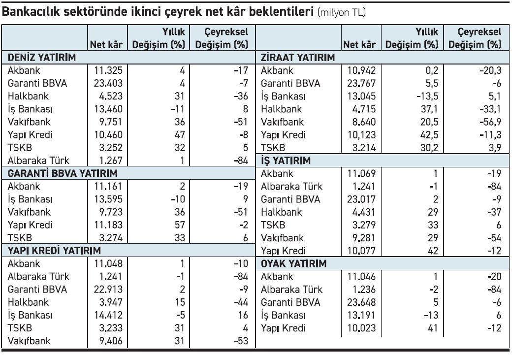 Komisyon gelirlerindeki artış ikinci çeyrekte bankacılık sektörü için en güçlü olumlu gelişme olurken 19 Mart sonrası artan politika faiziyle yükselen mevduat faizleri ile takibe düşen alacaklardaki büyümeyle artan karşılıklar net kârlılığı olumsuz etkiledi. Sektörde ikinci çeyrekte ilk çeyreğe göre çift haneli net kâr daralması bekleniyor.