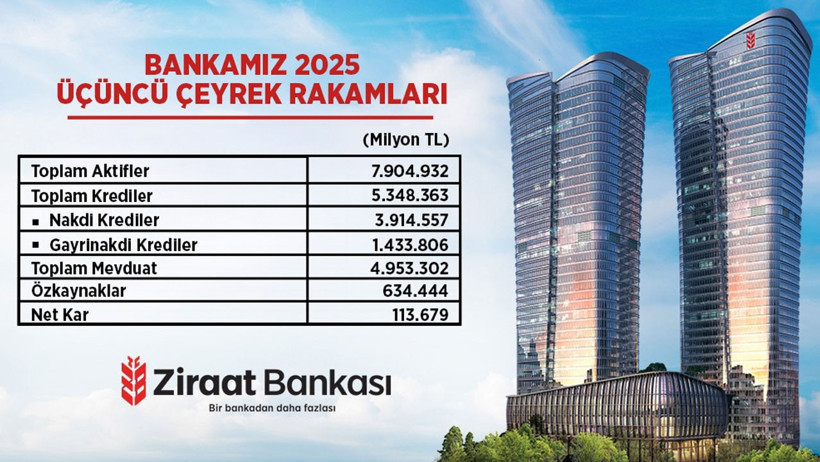 Ziraat Bankası, 2025 yılının üçüncü çeyreğinde aktif büyüklüğünü 7,9 trilyon TL’nin üzerine çıkararak sektördeki liderliğini sürdürdü. Banka, 113,7 milyar TL net kârla yılın ilk 9 ayında sektörün en kârlı bankası olmaya devam etti.